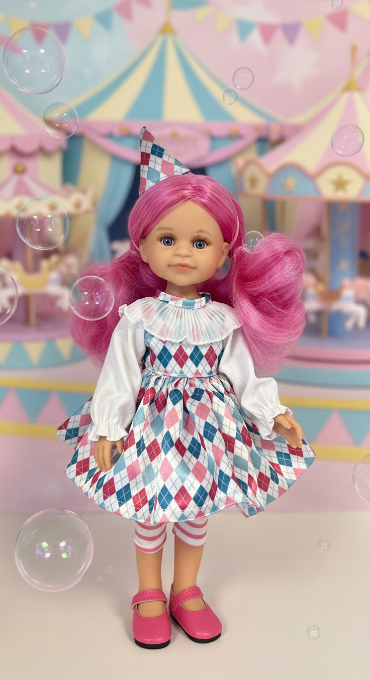 Lalka ubrana jest w karnawałowy strój. Satynową sukienkę z wielokolorowym wzorem w romby, ozdobione falbankami przy dekolcie i mankietami z marszczeniami. Leginsy w paski i zabawna czapeczka dopełniają całości. Ostatnim szlifem są różowe włosy i buty.